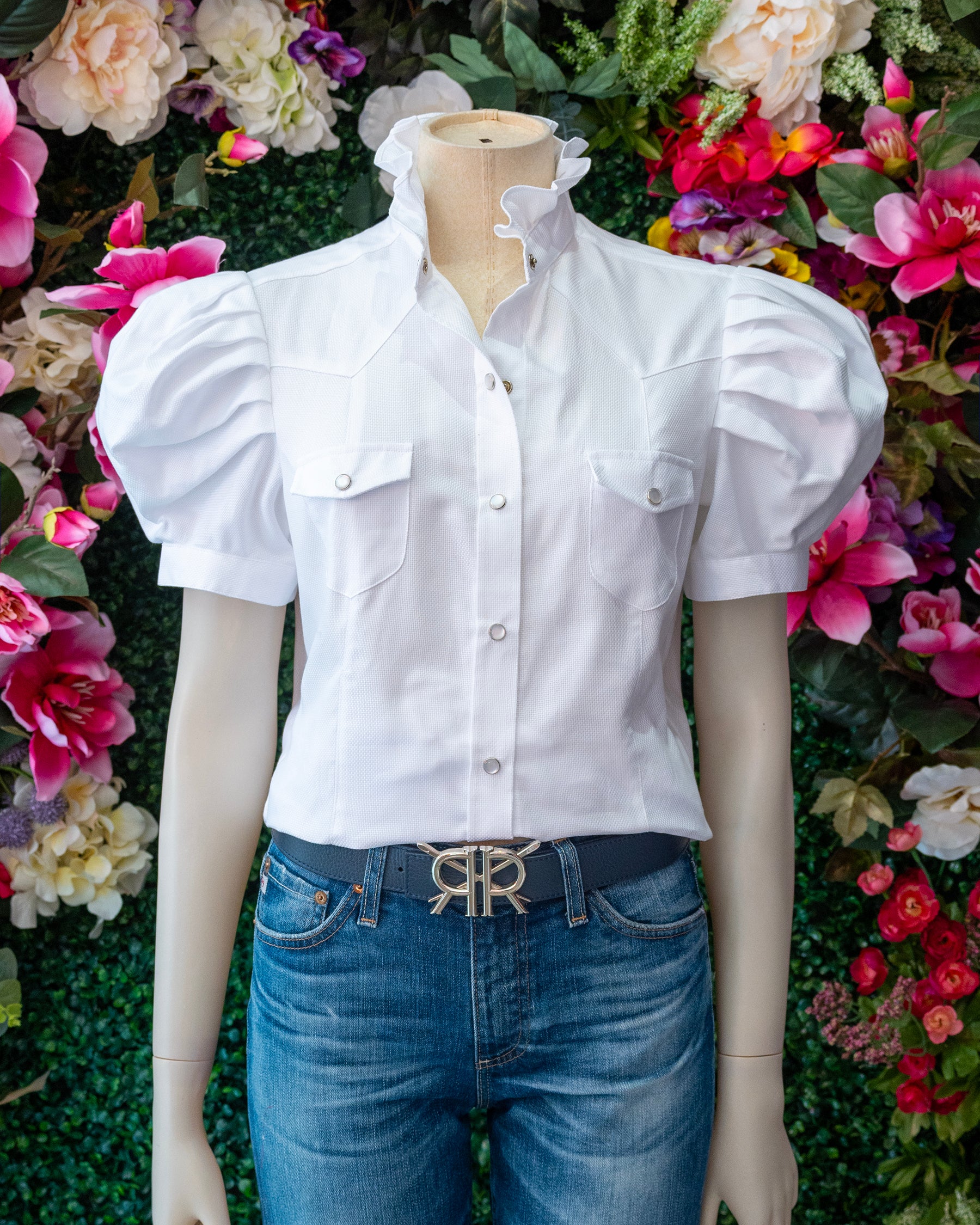 We started with the classic cowboy staple and refined it with a feminine ruffle neckline and pleated sleeves that add graceful volume at the shoulder, naturally highlighting a more flattering, nipped-in waist. Custom made to your measurements on file and available in crisp White or classic Black, it’s polished for the boardroom and right at home on the wide-open range. Order by size or we will use your measurements on file.   Please allow 4 weeks for delivery.